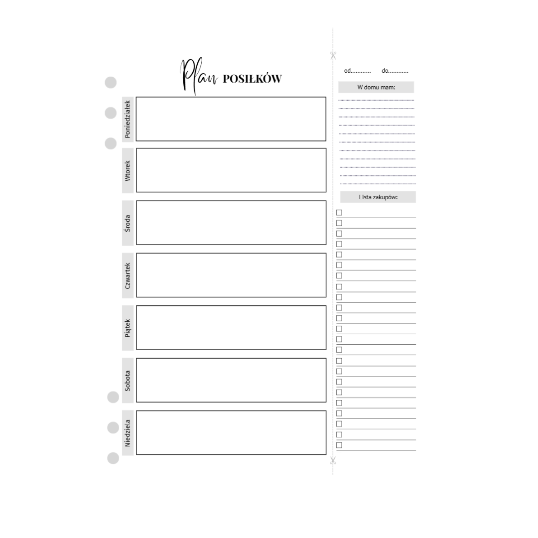 To już nie jest plik PDF, to praktyczny – wpinany do organizera A5 na 6 dziurek plan, który jest stworzony, by towarzyszyć Ci przez pełny rok! Dzięki niemu zapomnisz o impulsywnych zakupach, marnowaniu jedzenia i stresie związanym z codziennym wymyślaniem menu. Wystarczy, że usiądziesz raz w tygodniu, zaplanujesz posiłki i lista zakupów utworzy się sama.